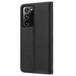 En plus de l’espace pour les cartes, cet étui portefeuille Note 20 Ultra peut également contenir quelques cartes de paiement, des factures, des reçus, des cartes de visite et éventuellement quelques pièces de monnaie. L’extérieur est composé de différents types et couleurs de cuir.